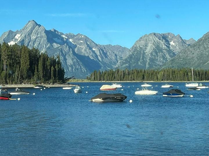 We decided to move on at the end of the day through the south entrance of the park. Through the various apps we use to find boondocking campsites, it appeared that people were having success camping in a roadside pullout just south of the park entrance. We set up there for a drink and cooked dinner, but the park rangers let us and a couple of others know that we wouldn’t be sleeping there for the night. The National Park Service has jurisdiction from the north entrance of Yellowstone to the south entrance of Grand Teton National Park, so boondock camping can be tough here. We drove south (at night) looking for a suitable spot and snuck into Leek’s Marina parking lot. Made it through the night without a knock on the door and even got a shower in. This was the view the next morning.