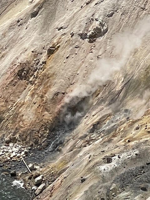The lower left photo shows a geothermal feature on the bank of the Yellowstone River that deposits molten sulphur into the river.